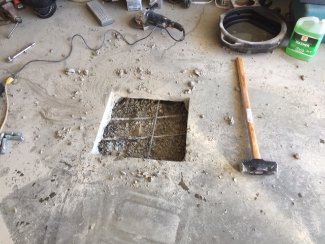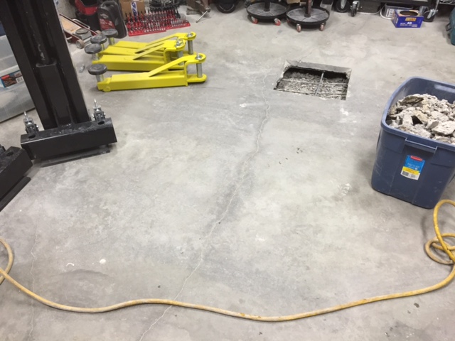 So now to fixing the problem. I used a side grinder (big one) with a masonry blade and cut out a square that is 3" wider then the lift plate in all directions. The blade is round so i cant get all the way into the corners without making a mess. I then went to the hardware store and bought a 10lb sledge hammer and started to beat the crap out of the square. Unsurprisingly it came out pretty easy. This did leave a substantial amount of dust on everything in the garage, i put plastic over the engine so no concrete dust would enter the intake/exhaust ports.