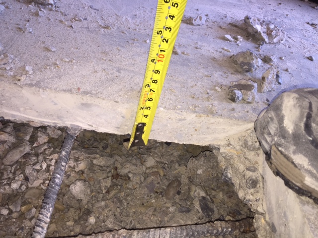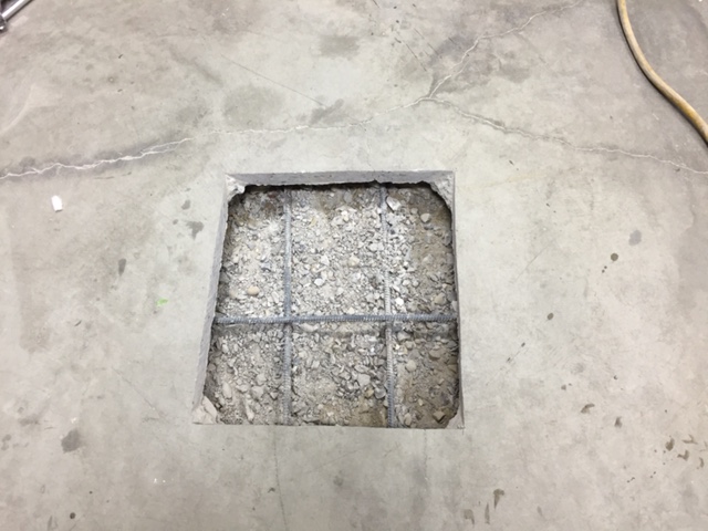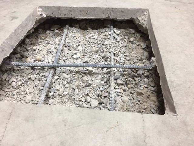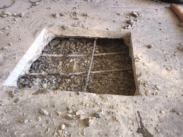 Now that the holes are done you can see what happened. The builder started by putting Re-bar directly onto the ground (not elevated at all). It would appear that the re-bar sunk into the soil a little before a 2" concrete slab was poured. The re-bar was sunk into the ground so the concrete never touched it (it floats under the floor). Many years pass and the ground started to sink leaving the re-bar just below the slab and creating a void.