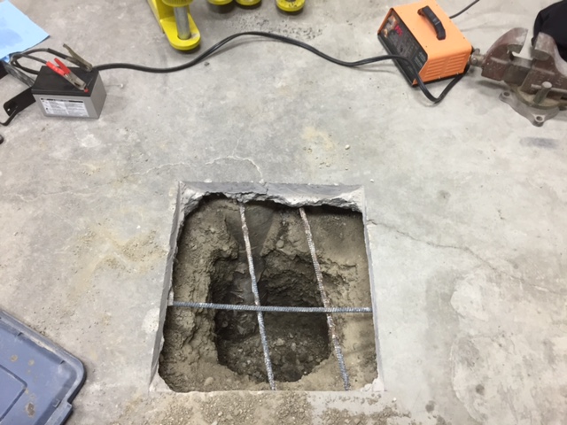 The new concrete will be poured though the existing re-bar, I will also add 16' of Re-bar into the new holes. The holes are 1.5' wide and 3' deep, it will also lock into the bottom of the existing slab. This should produce a safe footing for the lift.