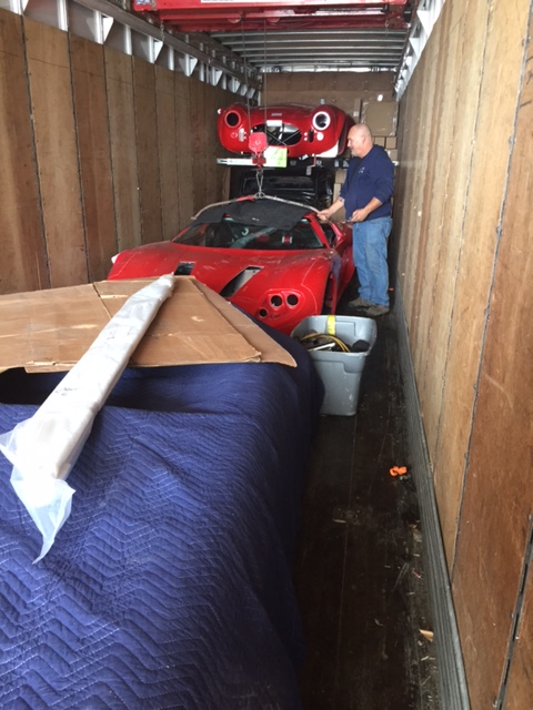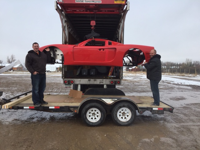 We arrived in Sweetgrass at 11:30AM. Both of us were unable to get cell phone reception, the Stewart Transport driver asked us to wait in "the big parking lot on the US side" so we figured that meant the lot across from the duty free. Jim (truck driver) arrived around 1:10PM (on time). He opened up the back of his trailer and in i went to get my first look at the car. To be honest its almost exactly what i expected. The Fiberglass seams are a little rougher then i expected but the size and overall look of the car are exactly what i was expecting.