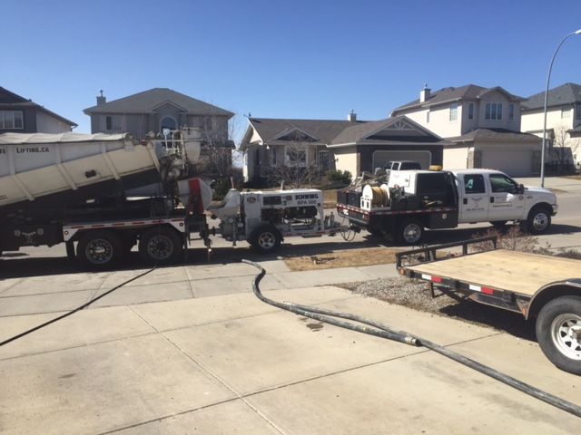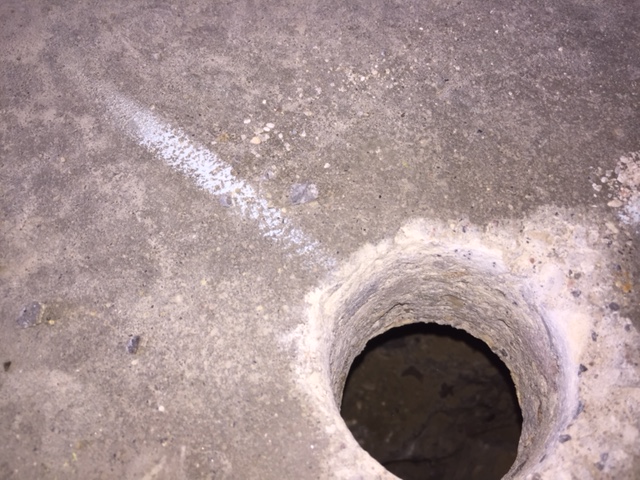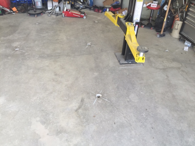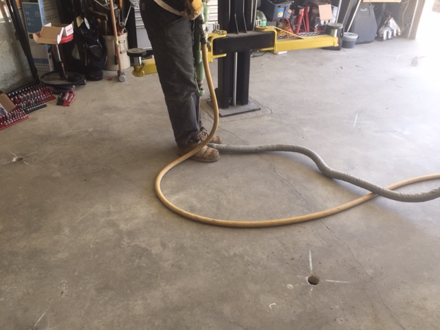 Concrete company came on Tuesday, they helped me carry the GTM frame out to the lawn and they started drilling 17 3" holes in the floor in a grid pattern. Once drilled we could see that the problem was even worse toward the back of the garage where there was almost a solid 12" of air under the 2" slab. They then used a high pressure pump to push concrete into the holes. You can even start to see water and concrete start to squish up through the cracks in the floor. The whole operation took 2 hours and cost $1800.