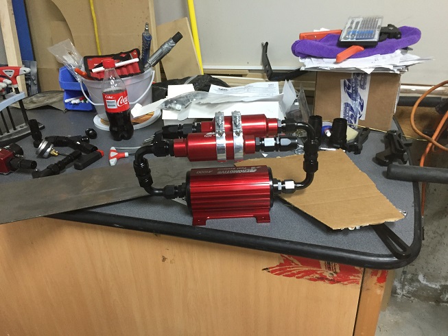 I have completely planned out the fuel system, everything is mocked up now with the proper AN connectors and nice stainless steel braided hoses. I should have done more research on the costs associated with the aluminum tanks mixed with proper AN connectors. So far the fuel system alone has set me back about $5000, that's for rails, tanks, AN ends and fittings, filters, pump, regulator, gauges, hoses, chrome mounts, etc. However if a had to do it again i don't think i would change a thing..... except for the bad planning that left me with tons of extra hose and AN fittings.