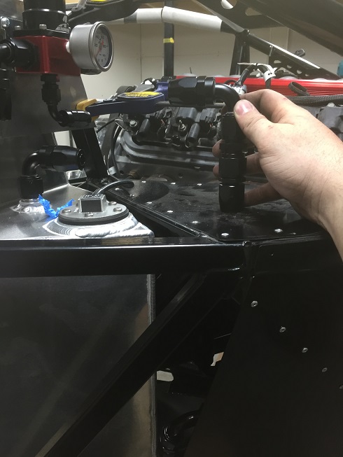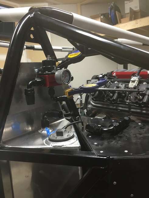 Regulator mounting location, i cut a piece of steel, it will be welded in soon. (I have since replaced some of these AN fittings to change the routing.